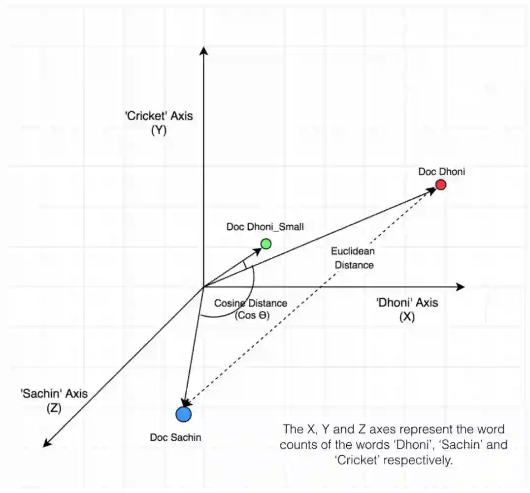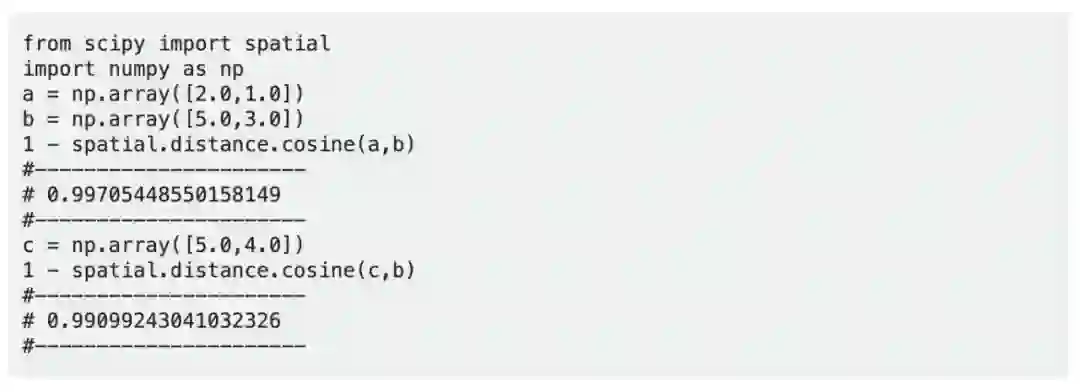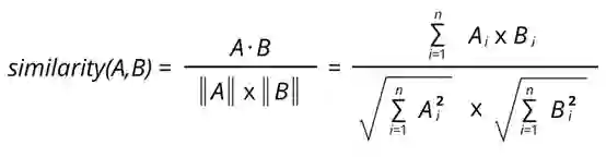 在任意类型的算法中,最常见的相似度度量是向量之间夹角的余弦,即余弦相似度。