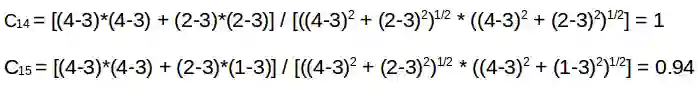 为了以更加实用的方式理解这一点,我们先根据上表计算一下用户 (A, C) 和 (B, C) 的相似度。