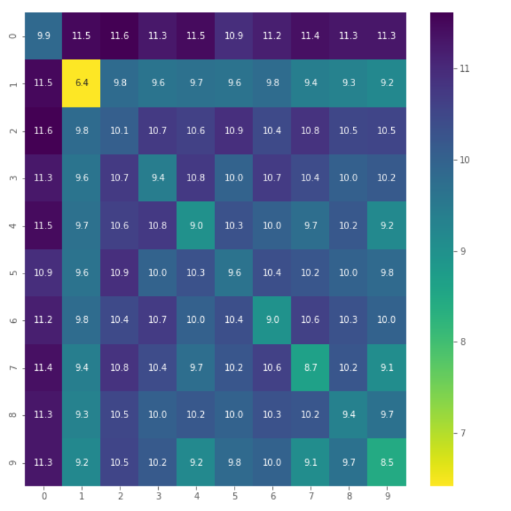 然而,上图的结果中数字 2 的类内距离 10.1 大于数字类别 2 与数字类别 1 的类间距离 9.8,数字类别 8 的类内距离 9.4 大于数字类别 8 与 1 之间的距离 9.3。