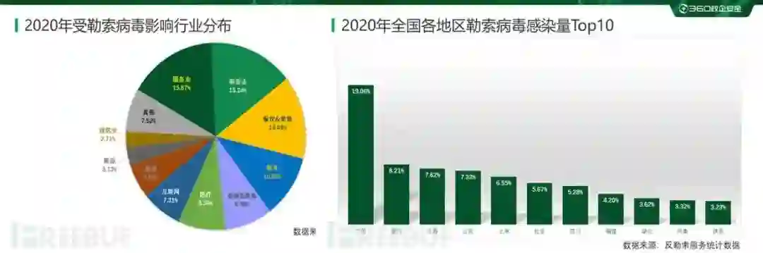 360安全大脑发布的《2020年勒索病毒疫情分析报告》显示,2020年,服务业、制造业、餐饮与零售、教育、医疗、及金融与贸易是受勒索攻击的主要行业;广东、浙江、江苏、山东、上海等区域受勒索攻击比较严重。