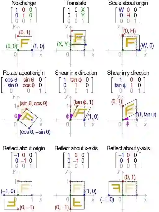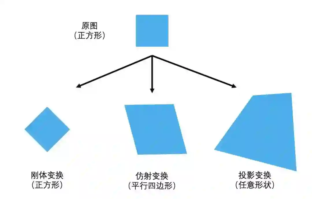 可以看到,相比刚体变换(旋转和平移),仿射变换除了改变目标位置,还改变目标的形状,但是会保持物体的“平直性”。