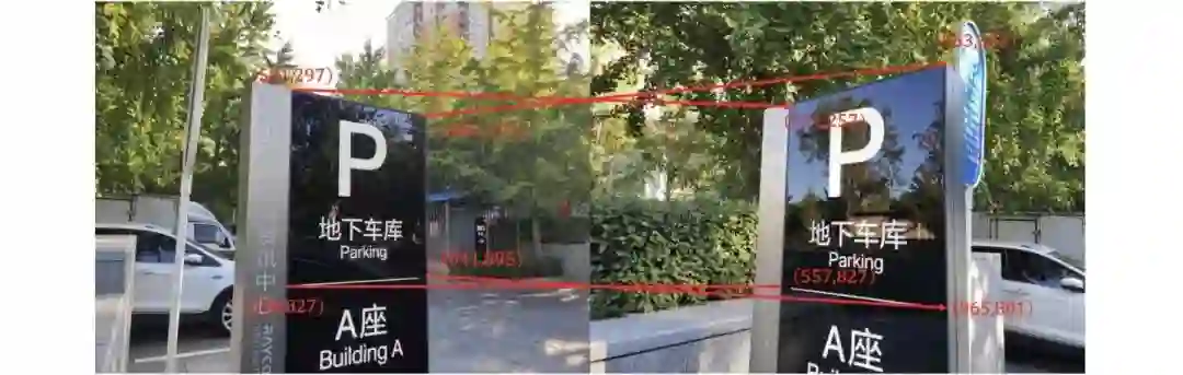 平面外背景物体不符合单应性原理,偏离很大,完全无法对齐。