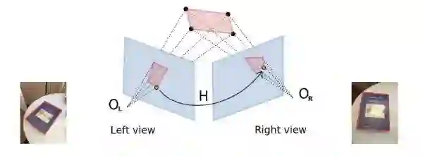 此处不经证明的给出:同一个 [无镜头畸变] 的相机从不同位置拍摄 [同一平面物体] 的图像之间存在单应性,可以用 [投影变换] 表示 。