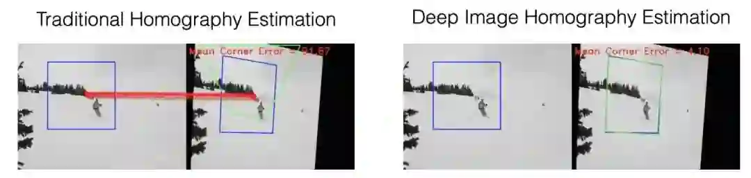 之前提到传统方法使用SIFT和Surf等特征点估计单应性。显然单应性最终估计准确度严重依赖于特征点和描述子性能。Google在ICCV 2017提出使用使用深度学习提取特征点。