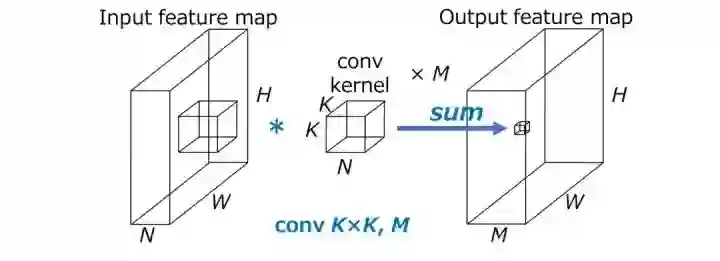 这里重要的一点是,标准卷积的计算量与(1)输出特征图H x W的空间大小,(2)卷积核K的大小,(3)输入输出通道的数量N x M成正比。