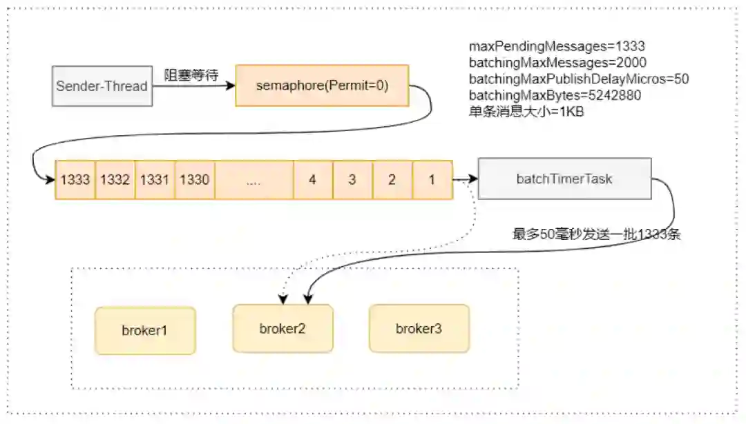 建议 batchingMaxPublishDelayMicros 不要过大,确保 batchingMaxMessages 比 maxPendingMessages 要大,否则等待 batchingMaxPublishDelayMicros 才会发送。