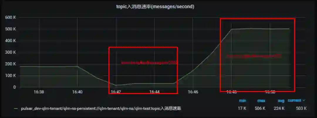 这里 maxPendingMessages(队列长度)=min(maxPendingMessages, maxPendingMessagesAcrossPartitions/partitionNum) 。而分区数添加(30 -> 120)后,需要重启客户端才对队列长度生效。重启后 maxPendingMessages 队列长度 从 40000/30 = 1333 变为 40000/120 = 333,出现了明显下降。