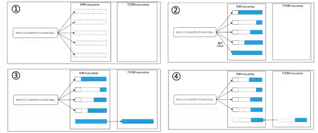 实践中可分为可用 Producer 和不可用 Producer 两个列表。在 ① 中,两个列表都处于初始化状态并可用;在 ② 中,某个可用分区阻塞一段时间后可以等待一段时间;若不可用就移动到不可用列表中,如 ③ 所示;当分区可用比例达到阈值再挪回可用列表,如 ④ 所示。