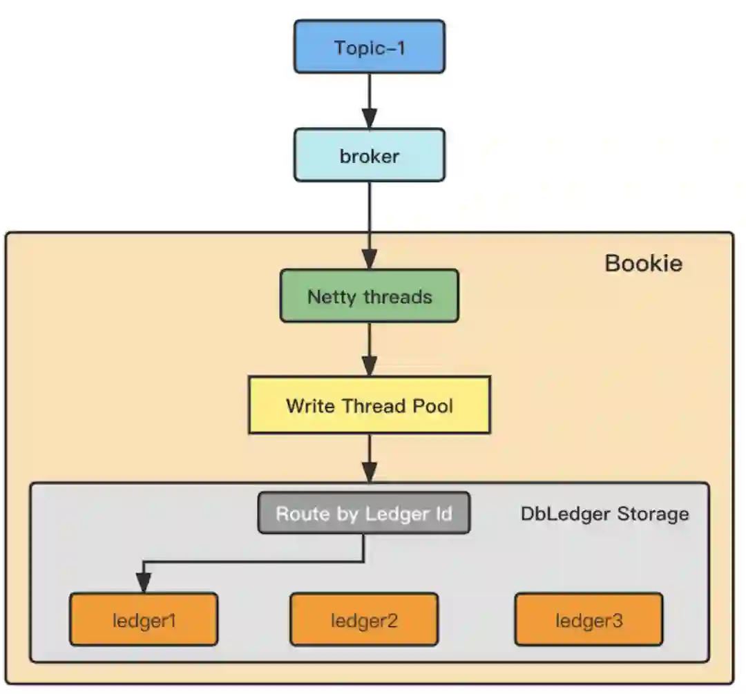 首先介绍数据写入 ledger 的过程。每一个 Topic 分区在一段时间内只创建一个 Ledger 维护分区写入的 Entry 的数据归属。Topic 分区写入的数据以 Entry 的形式,经过 Broker 写入 Netty 线程处理队列,线程依次根据 Entry 的 Ledger Id,对 Ledger 目录数取模,写入到目标磁盘 Ledger 目录,最终以 Entry Log 和 RocksDB 的索引方式存储。需要注意,Ledger 是一个分区在一段时间内写入数据的逻辑管理单位,维护了这段数据存储的 Bookie 位置。一个 Topic 分区在一段时间内写入的数据只被一个活跃 Ledger 管理,待该 Ledger 达到翻转条件后才会关闭 Ledger 并重新计算,创建新 Ledger 继续写入。