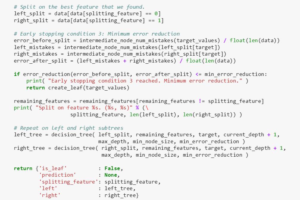 用 best_splitting_feature 找到最佳特征,并分裂成左子树和右子树,如果 error_reduction 返回值小于 min_error_reduction,创建叶子 (提前停止条件 3)。同时将最佳特征从 remaining_features 删除
