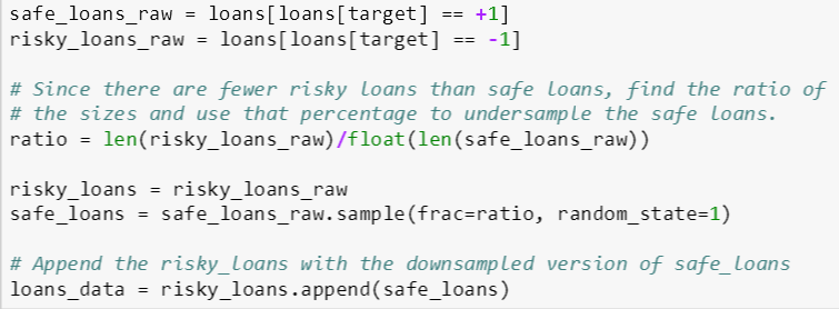 首先计算出好坏贷款的个数,并计算出它们的比例 ratio,由上节结果知道好贷款比坏贷款多 (大概 4 倍左右),因此在好贷款中随机选取 1/4 和原先的坏贷款组成 (用 append() 函数) 新的贷款数据。这是一种欠采样的方法,即去除一些正例使得正反例数目相近,然后在进行学习。但是欠采样法可能会丢失一些重要信息。业界通常用集成学习机制 (ensemble method),将正例划分给几个集合供不同模型使用,这样对每个模型来看都是欠采样,但在全局来看确不会丢失重要信息。在本贴重要是为了平衡化样例类别,就不深究那些复杂采样的方法了。