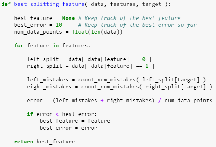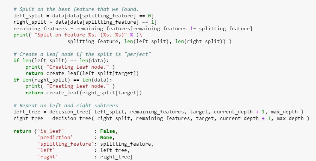 用 best_splitting_feature 找到最佳特征,并分裂成左子树和右子树,同时将最佳特征从 remaining_features 删除