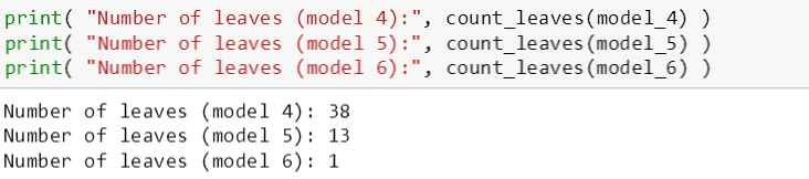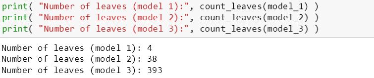 接下来看出三个模型含叶子树,发现模型 1 只含有 4 片叶子,太过于少;而模型 3 含有 393 片叶子,太过于多;模型 2 正好,而且对应的验证误差最小。