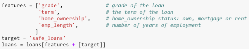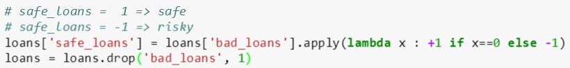 csv 里面有一栏 (标签) 叫 bad_loans,其中 0 代表良性贷款 1 代表恶性贷款。本章用 -1 和 1 代表良性贷款和恶性贷款。以下的代码将 bad_loans 的 0 和 1 转换成 safe_loans 的 1 和 -1。