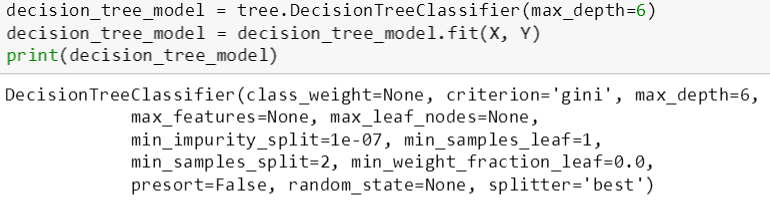 斯蒂文用 DecisionTreeClassifier 函数来建立两个树模型,最大树深 (max_depth) 分别是 6 层和 2 层,因此第一棵树 (适中树) 比第二棵树 (简单树) 复杂。然后用 fit() 函数来拟合 X 和 Y 生成树模型。从打印树的信息可看出,该模型用的是基尼指数 (gini) 来划分特征。
