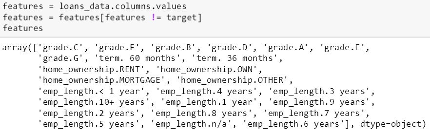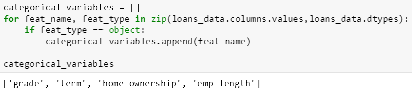 下面代码是找出 loans_data 里面所有非数值型特征值对应的特征,本例的四个特征都属于此类而被找出。