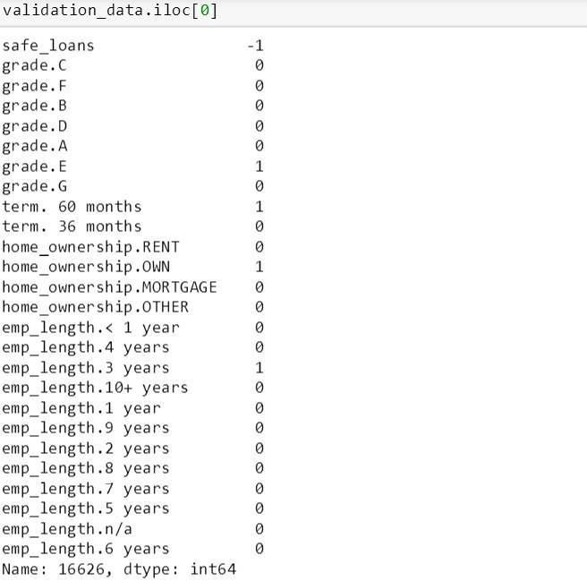 训练完之后来看看两棵树在第一个验证数据上的分类结果,从下面信息看,这笔贷款是危险贷款 (safe_loans 的值为 -1)