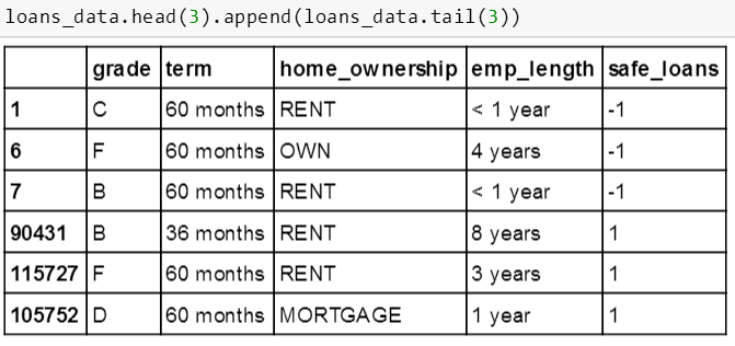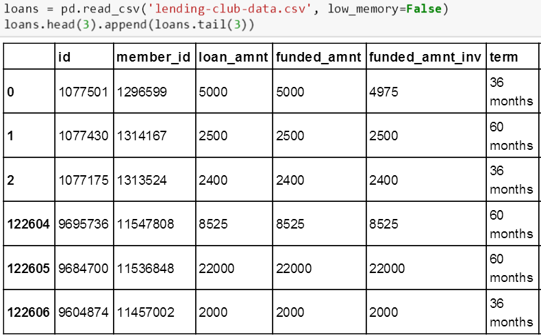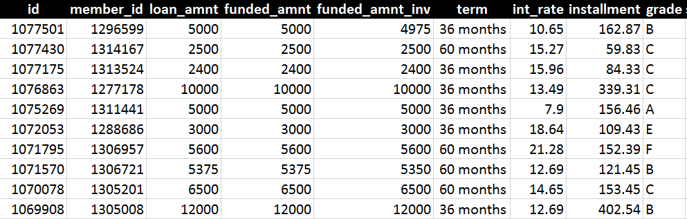 上图记录着一些重要特征如 loan_amount, term, int_rate 和 grade,分别指是贷款本金、年限、利率和评级。