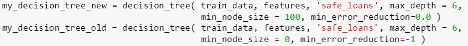 接着斯蒂文用上面程序训练了两棵树 (新树和老树),它们的区别是 min_node_size (100 和 0) 和 min_error_reduction (0 和 -1),很明显新树不容易过拟合,因为它允许叶节点包含的数据个数是 100 个,而且不允许分裂后的误差小于 0 (即不允许分裂后误差增大)。