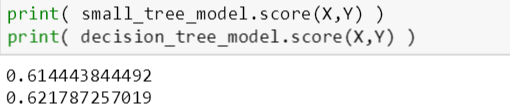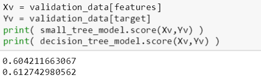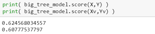 复杂树的在训练数据和验证数据的准确率分别是 62.45% 和 60.78%,适中树的在训练数据和验证数据的准确率分别是 62.19% 和 61.27%,简单树的在训练数据和验证数据的准确率分别是 61.44% 和 60.42%。