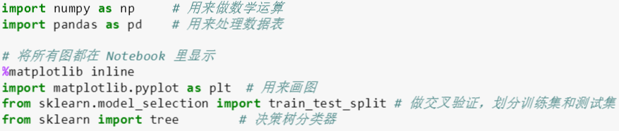 此外 train_test_split 是用来划分训练和测试集,而 tree 是 sklearn 自带的决策树模型,可以直接拿来用。