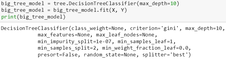 用 score() 函数来评估树的分类准确率,由上图可知,适中树比简单树的训练误差和验证误差低 (准确率高)。接下来用最大树深 10 层来生成一棵复杂树,如下: