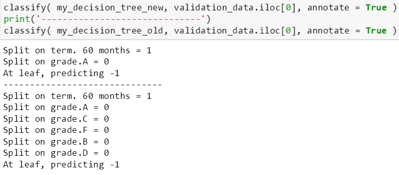 用上一章 classify 函数来看看分类结果,很明显新树只需要 2 次分裂就能到达叶节点来预测这笔贷款是恶性贷款;而老树需要 6 次分裂才能预测它是恶性贷款。