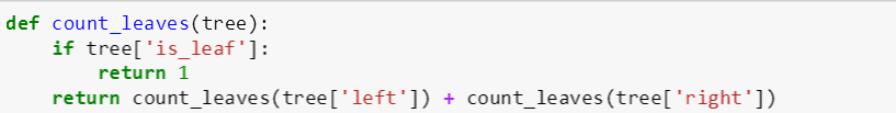 一般来说,树越复杂,它的叶子数也就越多。count_leaves 函数的输入变量是一棵树上,如果这棵树是叶子,那么返回 1 代表着一片叶子;如果不是叶子,那么用递推方式将 count_leaves 函数作用在它的左子树和右子树上。