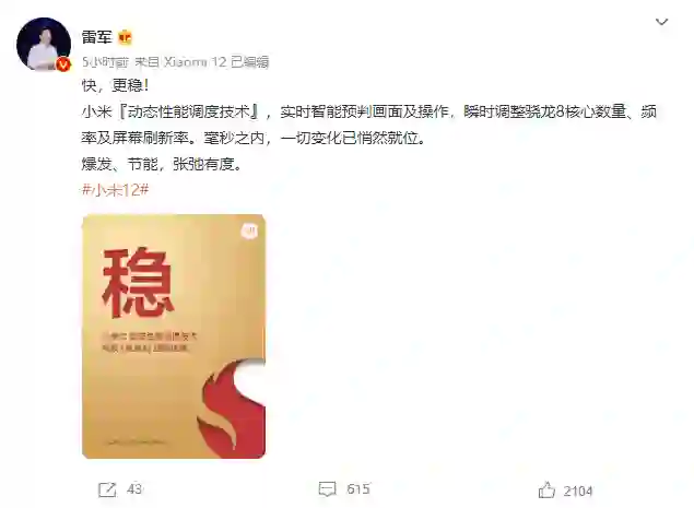 小米创办人、董事长兼 CEO 雷军今日再次为小米 12 预热,他表示小米支持的“动态性能调度技术” 可实时智能预判画面及操作,瞬时调整骁龙 8 核心数量、频率及屏幕刷新率。“快,更稳”就是小米 12 驾驭“骁龙 8”的目标。