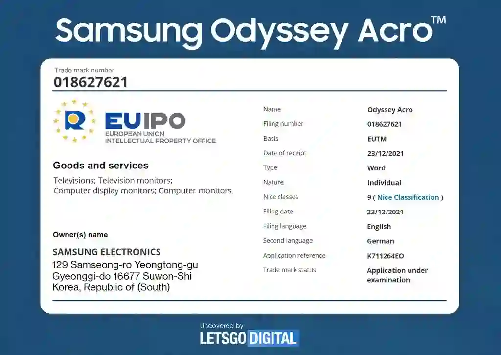 该商标申请于 2021 年 12 月 23 日提交至欧盟知识产权局(EUIPO),该申请被归入第 9 类,描述为“电视显示器和计算机显示器”。三星很可能将这个型号的名称用于其未来的一款游戏显示器。“Acro”这个单词来自于希腊语“akros”,含义是“高处、顶点、尖端”。