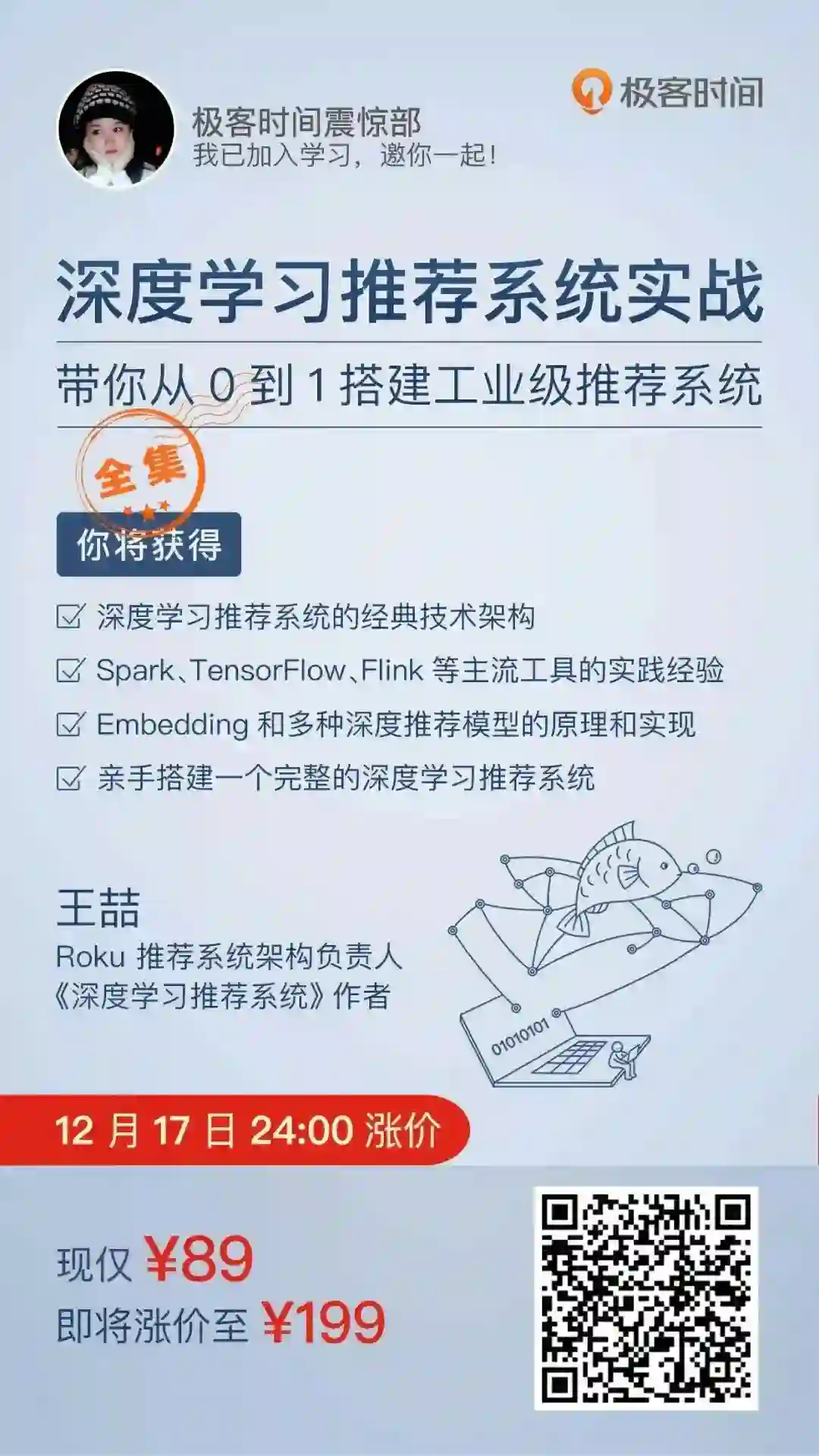 以上这些在内的,一整套深度学习推荐系统。不说它能支撑起一个中大型公司的推荐系统,但是毫无疑问,它可以成为一个 工业级推荐系统的种子项目。而这一切,都能在课程里,一步步尝试搭建起来。