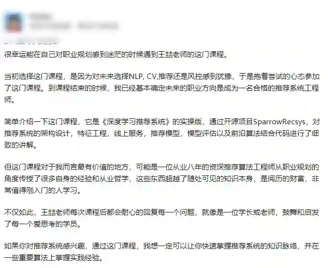 可以说,王喆老师的书也好,课也好,从未叫人失望过,而且他人也特别 nice,经常在专栏下面跟读者留言互动,这种耐心和责任心,真不是一般人有的。这里分享一位粉丝的留言: