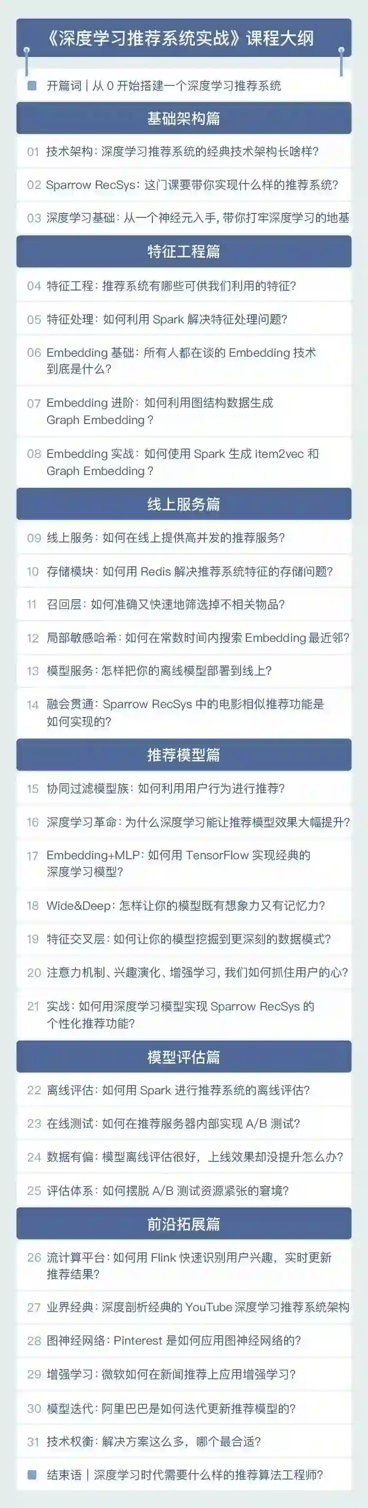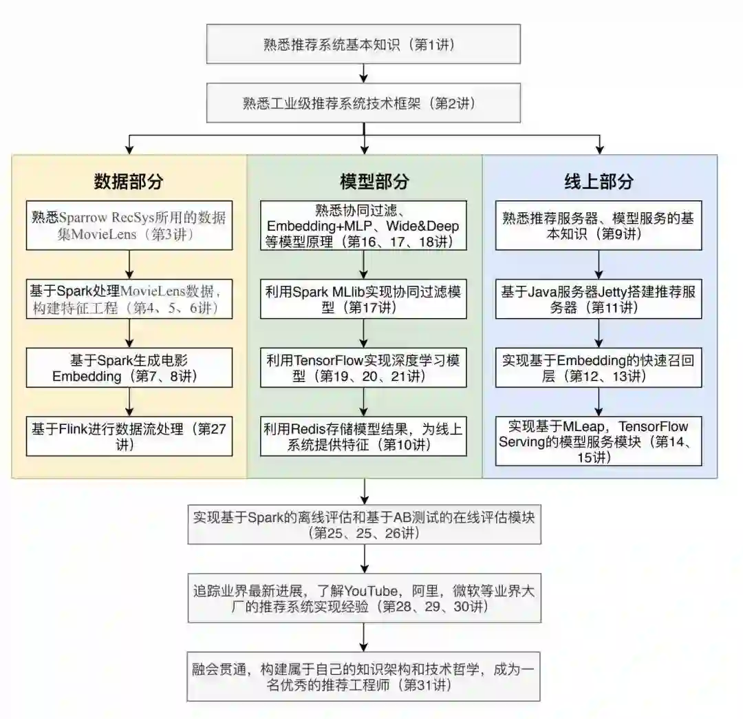 基础架构篇: 讲要从 0 开始实现的推荐系统, Sparrow RecSys 的主要功能和技术架构,也会用到 Spark、Flink、TensorFlow 等业界最流行的机器学习和大数据框架。