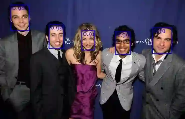 网络返回每张面孔的边界框与相应的分数,即显示面孔的每个边界框的概率。这些分数用于筛选边界区域,因为图像中可能根本不包含任何面孔。注意,即使只有一个人要检索边界框,人脸检测也应该执行。