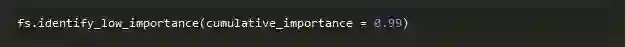 这种方法构建立在零重要性函数的基础上,再利用模型中的特征重要性进行进一步的选择。由函数identify_low_importance可知,低重要性特征并不影响某些指定的总重要性。
