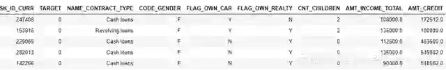 示例中使用的是Kaggle上家庭信用违约风险机器学习竞赛的数据样本。整个数据集可以下载,演示样本如下: