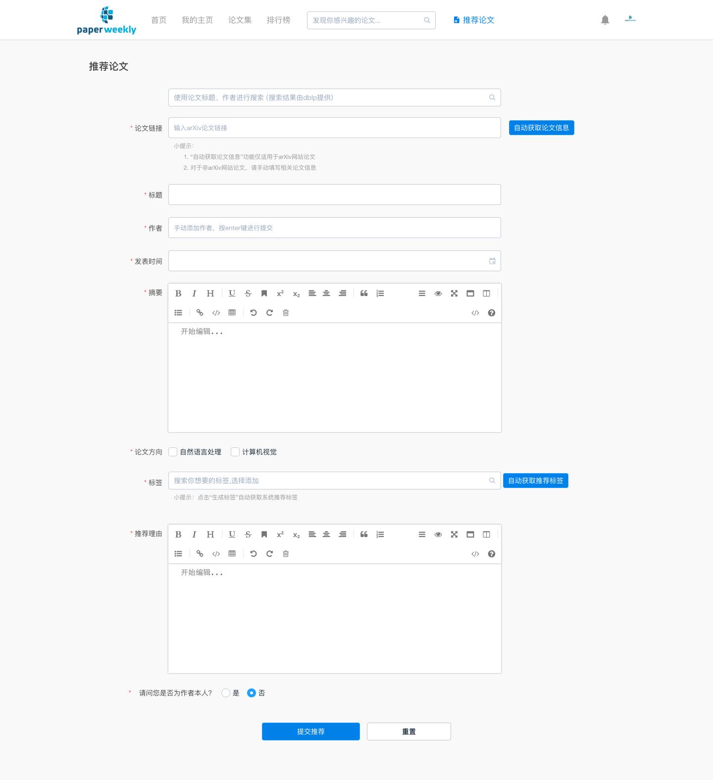当你填充完这些信息之后,剩下的就是一个充分的推荐理由,为了让你的表达更加多元化,我们提供了 markdown + latex,相信越充分的推荐理由,就越会受到大家的青睐。