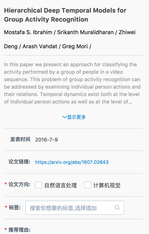 由于我们整个社区的内容都是由标签来组织的,所以在标签这块,设计了一个自动获取推荐标签的功能,通过 paper 的内容来推测可能的标签,当然现在的方法还是用了一些无监督的简单思路,等社区成长一段时间,我们将会换监督学习来做。另外,我们之前报道过一篇做 keyphrase 生成的 paper,也会尝试去用一下。