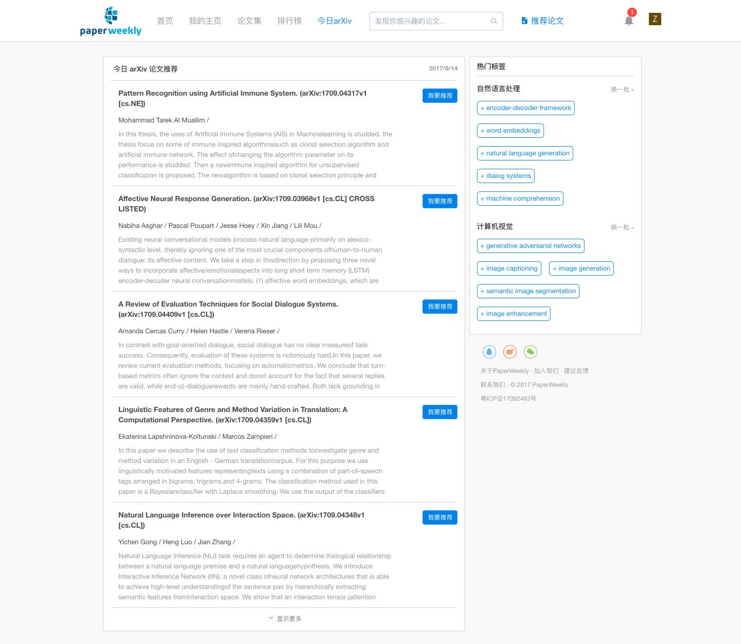 我们会根据用户关注的标签来帮助用户过滤出今天 arXiv 中可能会感兴趣的 paper,如果恰好有你觉得不错的 paper,那么请你记得点击我要推荐,将它一键推荐到社区里,让更多的人看到今天有有哪些好 paper 值得看,让更多的人来评价这些 paper 是否真的值得看。