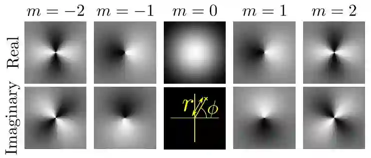 这里,r、φ是图像/特征映射的空间坐标,以极坐标的形式表示。m∈Z是旋转顺序,R:R+→R是一个方程,成为radial profile,控制滤波器的总体形状。β∈[0,2π)是一个相位偏移项,可以让滤波器选择方向。下图是一个示例: