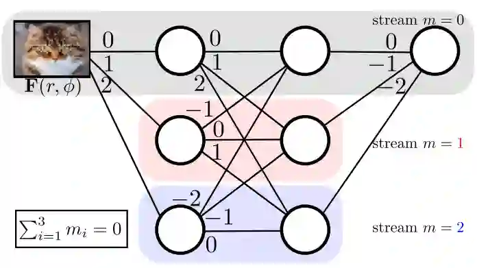 这就是一个有两个隐藏层的H-Net示例,其中输出的m=0。每个横条代表一系列的特征映射,线条表示它们之间的关系,并且表明了对应滤波器的旋转顺序。
