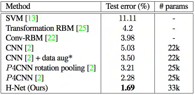 在这一数据集中有10000张训练图片,2000张验证图片和50000张测试图片。将图片进行260°旋转对传统CNN来说是个不小的挑战,但在H-Nets上情况完全不同。以下是实验结果: