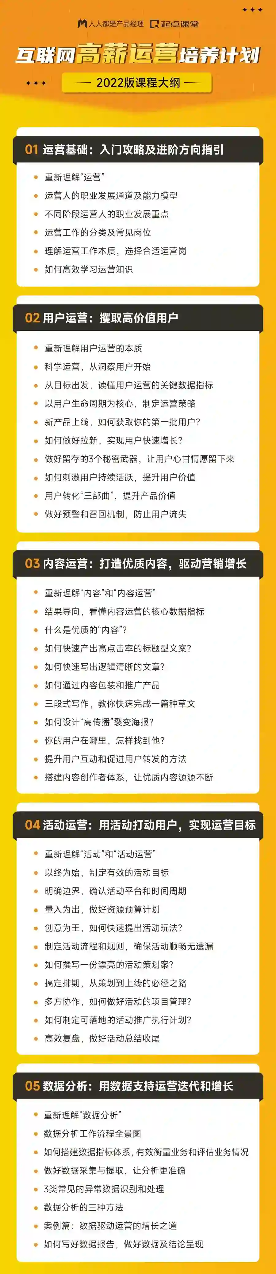 以下是课程大纲,可以看到每个版块都有很详细的知识点,非常体系化和完善,学完课程这些内容可以让大家对运营工作有一套系统的工作方法,以后就不用担心野路子,懂得多会的浅这种情况发生啦~