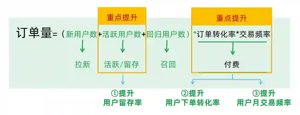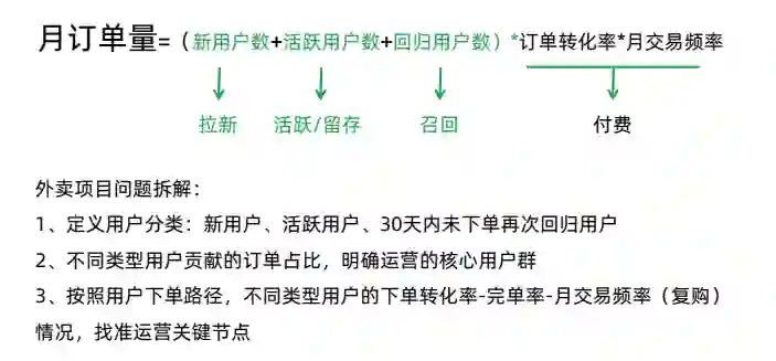 首先看看订单是怎么产生的?月订单量=用户 × 转化率 × 交易频率。根据这个公式,用户数和月订单量是成正比的,用户数越多,订单量越大。