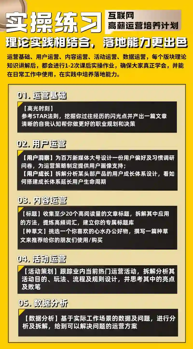 通过从0到1完成具体的运营工作任务,输出作品、积累项目经验,让知识不再是知识,而变成可以落地实践的方法论。