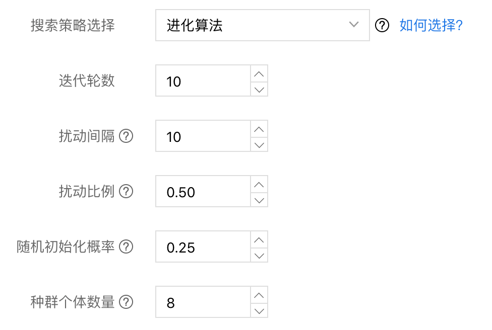 其它选项和贝叶斯搜索的含义一致,也不重复了。进化算法的配置需要对算法的原理有一定的了解,如果对算法不明白的,就直接用百度给的默认值吧!