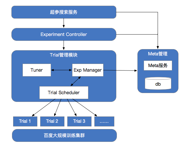 3. Trial 是具体的训练试验,一个 Experiment 会产生多个 Trial 来探索不同超参数组合的最终效果。Tuner 是超参生成的模块,会根据选择的超参搜索算法,推荐下一个 Trial 所使用的超参值。在 Trial 管理模块中,Exp Manager 会负责生成若干 Trial,向 Tuner 请求具体的试验超参数,并向 Trial Scheduler 发送 Trial 任务信息。