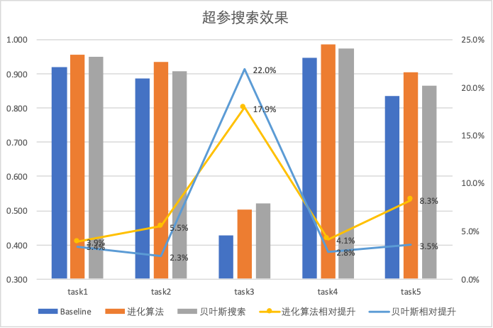 图中左边纵轴为模型的准确率,右边纵轴为超参搜索算法在效果上提升的比例。可以看到在不同数据集上使用超参搜索后效果均有提升,在默认参数精度已经超过 85% 的情况下,使用超参搜索仍能提升约 5%,在默认参数效果较差的情况下,超参搜索的提升效果更为明显,可高达 22%。