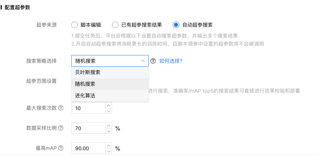 目前 BML 支持了三种超参搜索算法,如图,分别是