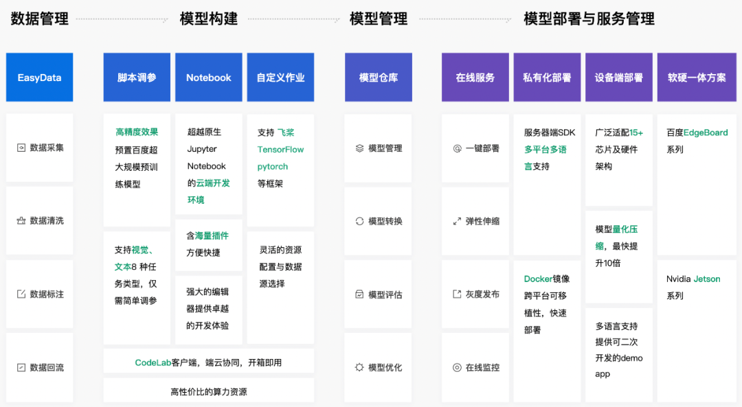 从数据采集、数据清洗、数据标注、智能标注与多人标注、模型训练生产到模型管理、云端及离线推理服务管理等 AI 开发过程的全生命周期管理功能。